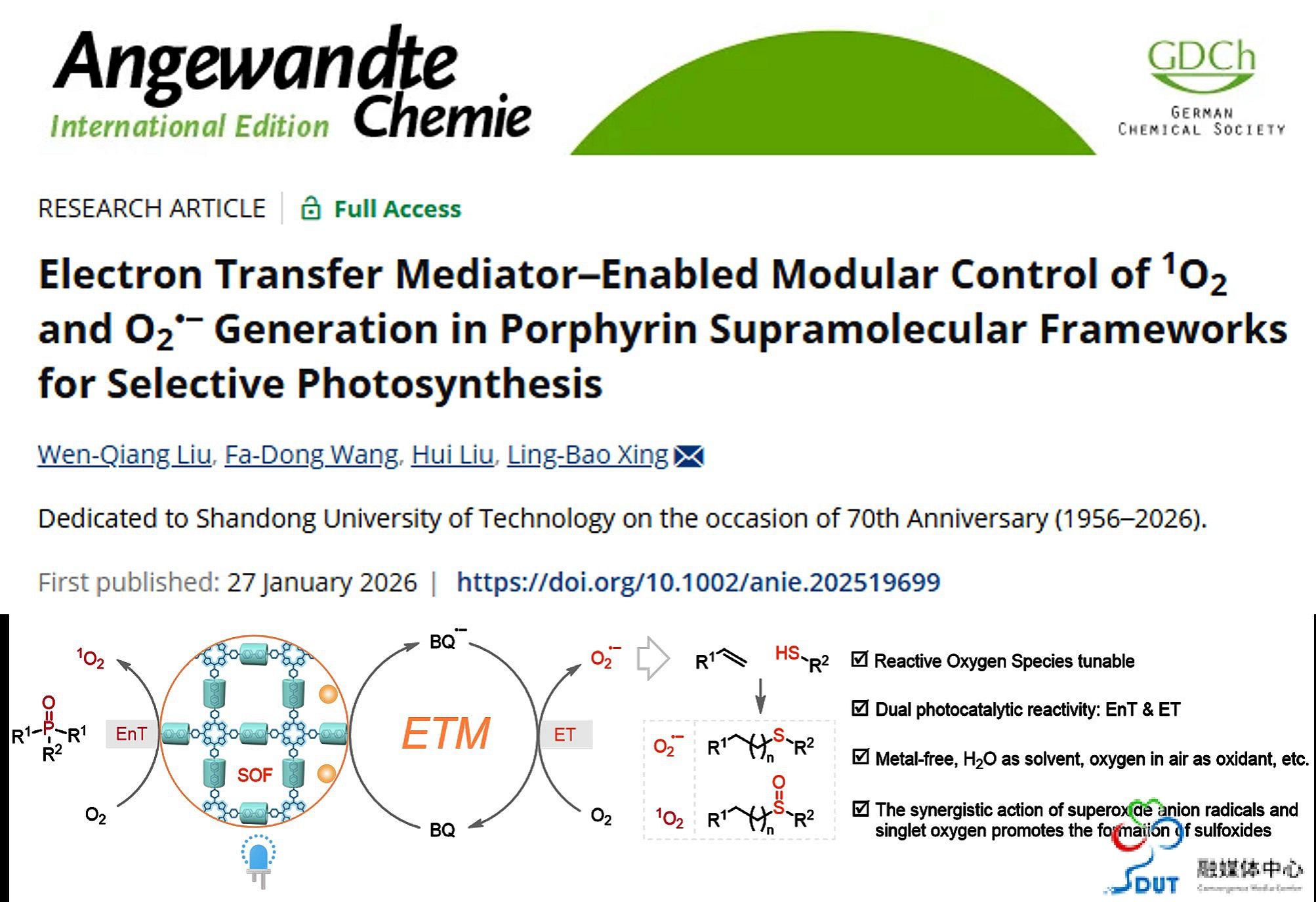 上述研究不仅在机制层面提出了ETM介导ROS路径切换的普适策略,而且在应用层面构建了符合绿色化学原则的可持续光催化体系,兼具基础创新性与应用潜力,充分体现了学校在超分子光化学与自组装领域的原创研究实力,为学校70周年校庆献上了一份高水平学术成果。