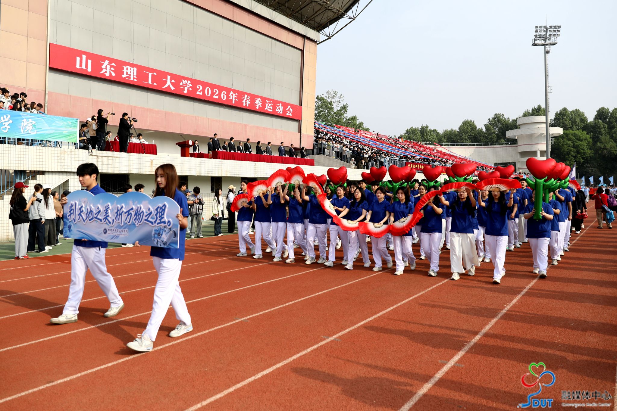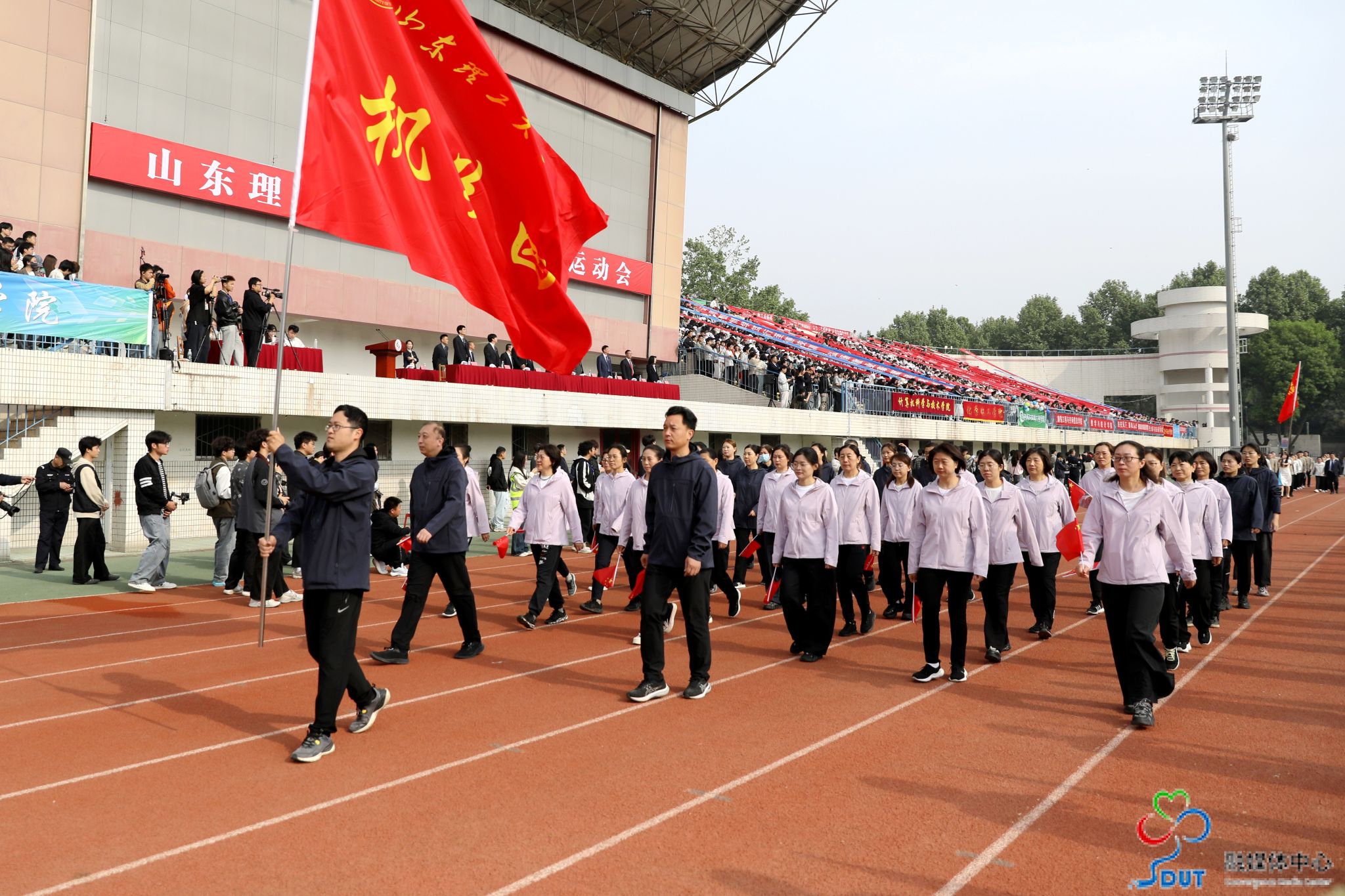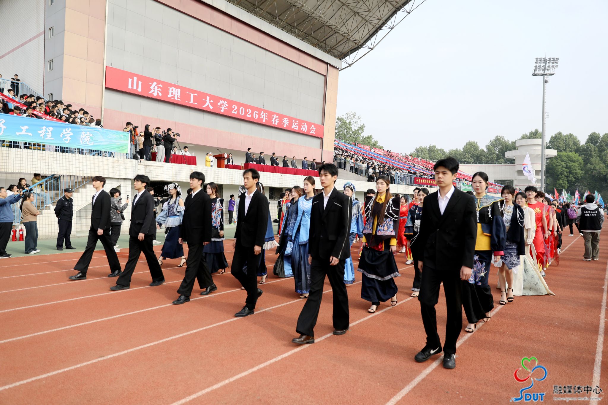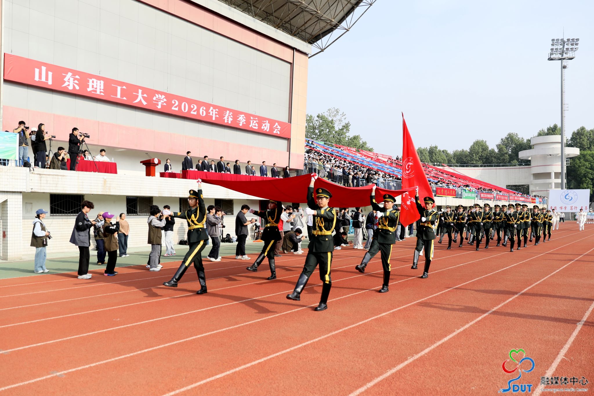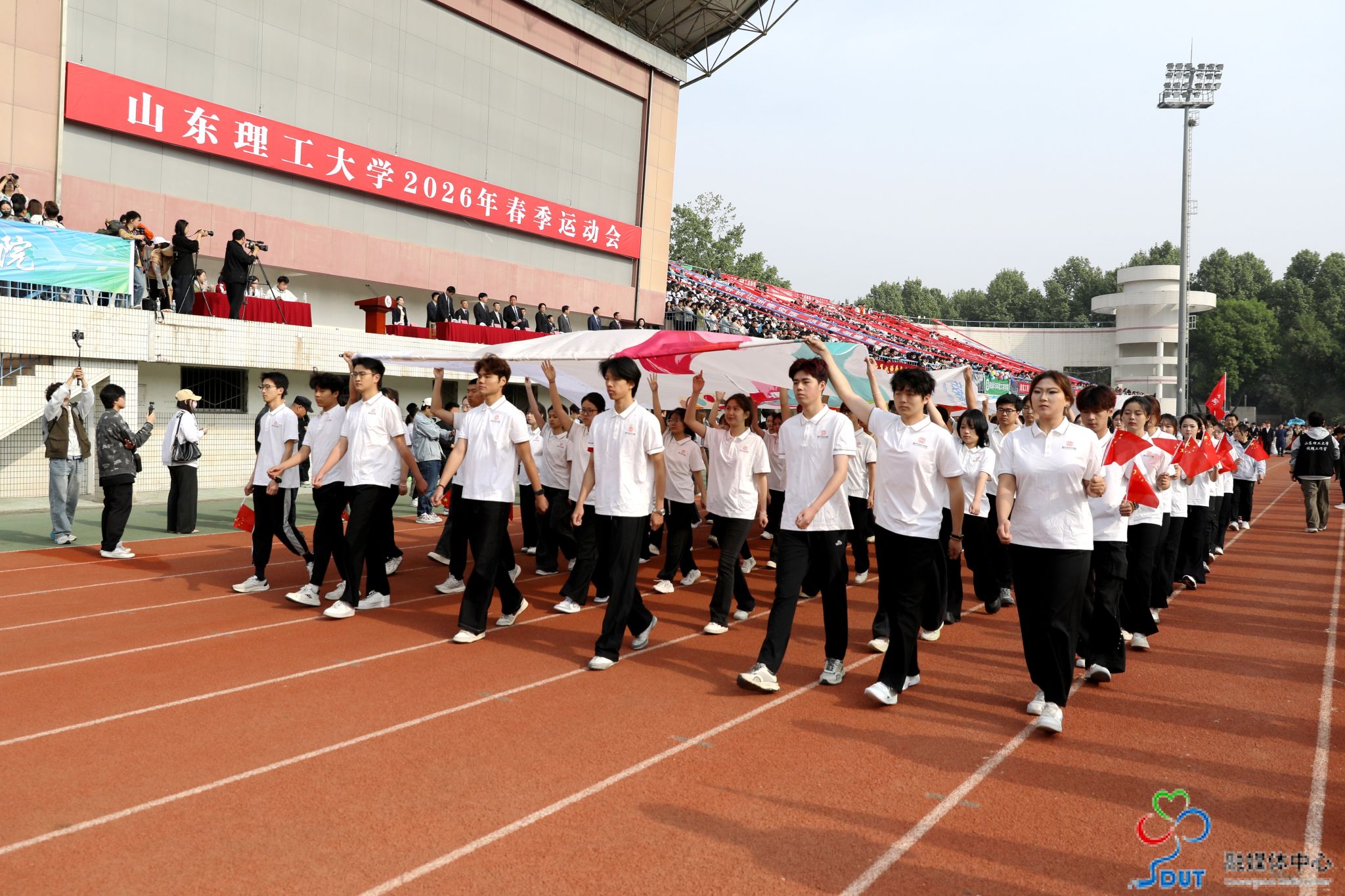 伴随着激昂的运动员进行曲,精神抖擞的国旗、校旗、校徽方阵,青春靓丽的花束方阵、朝气蓬勃的彩旗方阵、意气风发的裁判员方阵及各代表队依次入场,迈着整齐矫健的步伐通过主席台,部分代表队进行了独具特色的个性化形象展示,充分展现了山理工师生激情澎湃、斗志昂扬的精神风貌。在雄壮的国歌声中,鲜艳的五星红旗升起在会场上空。