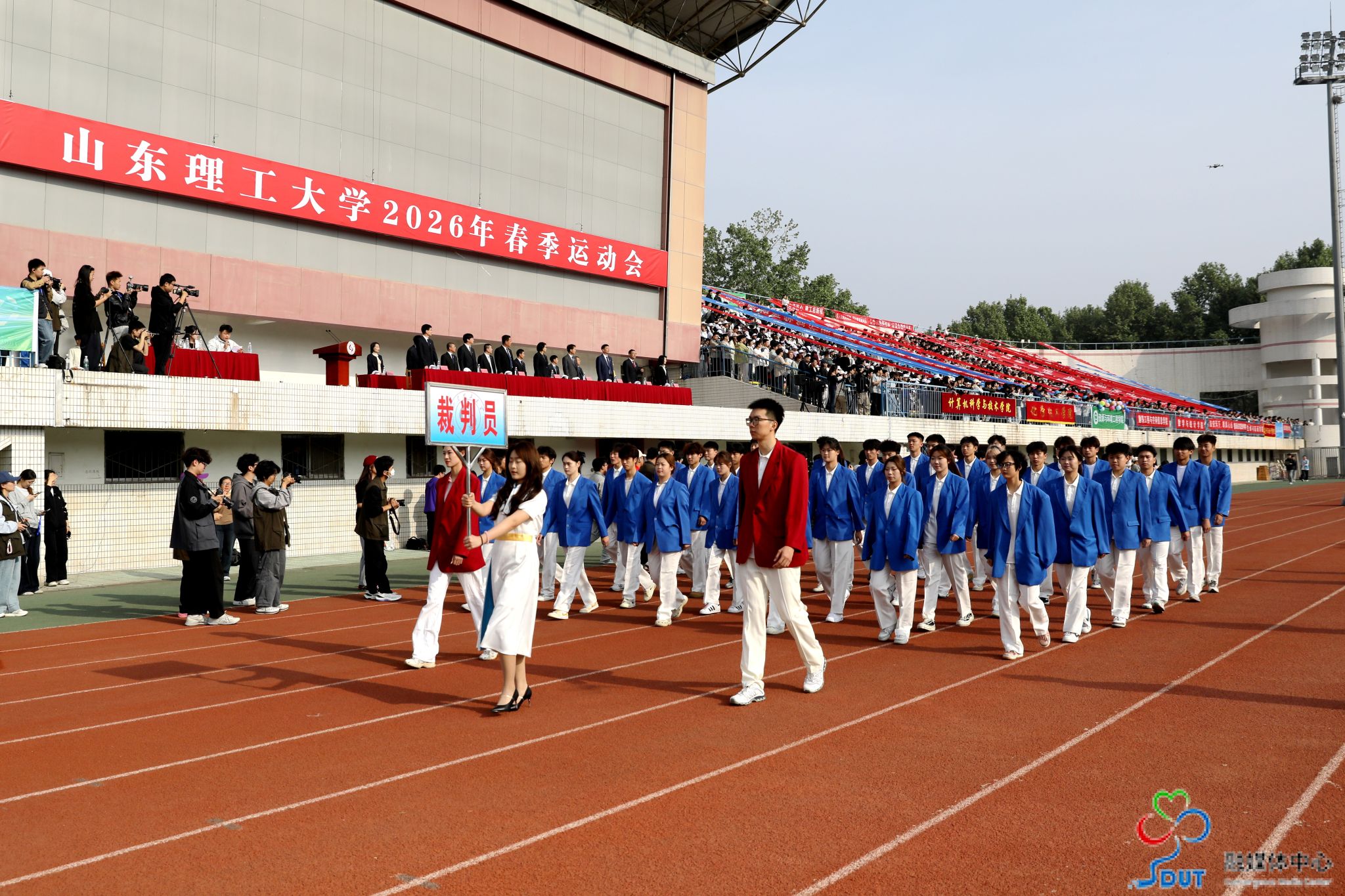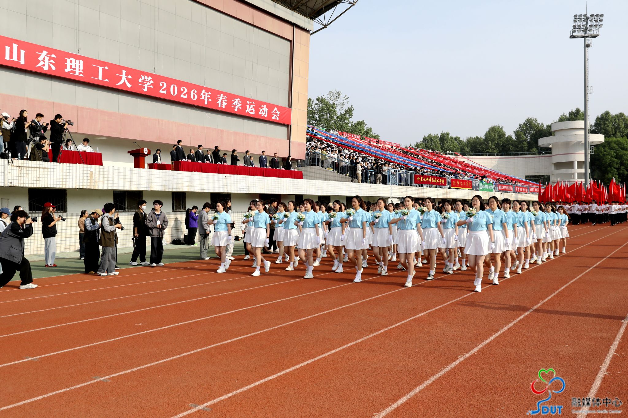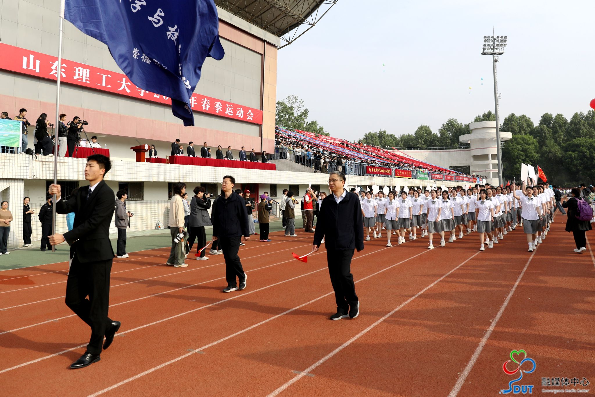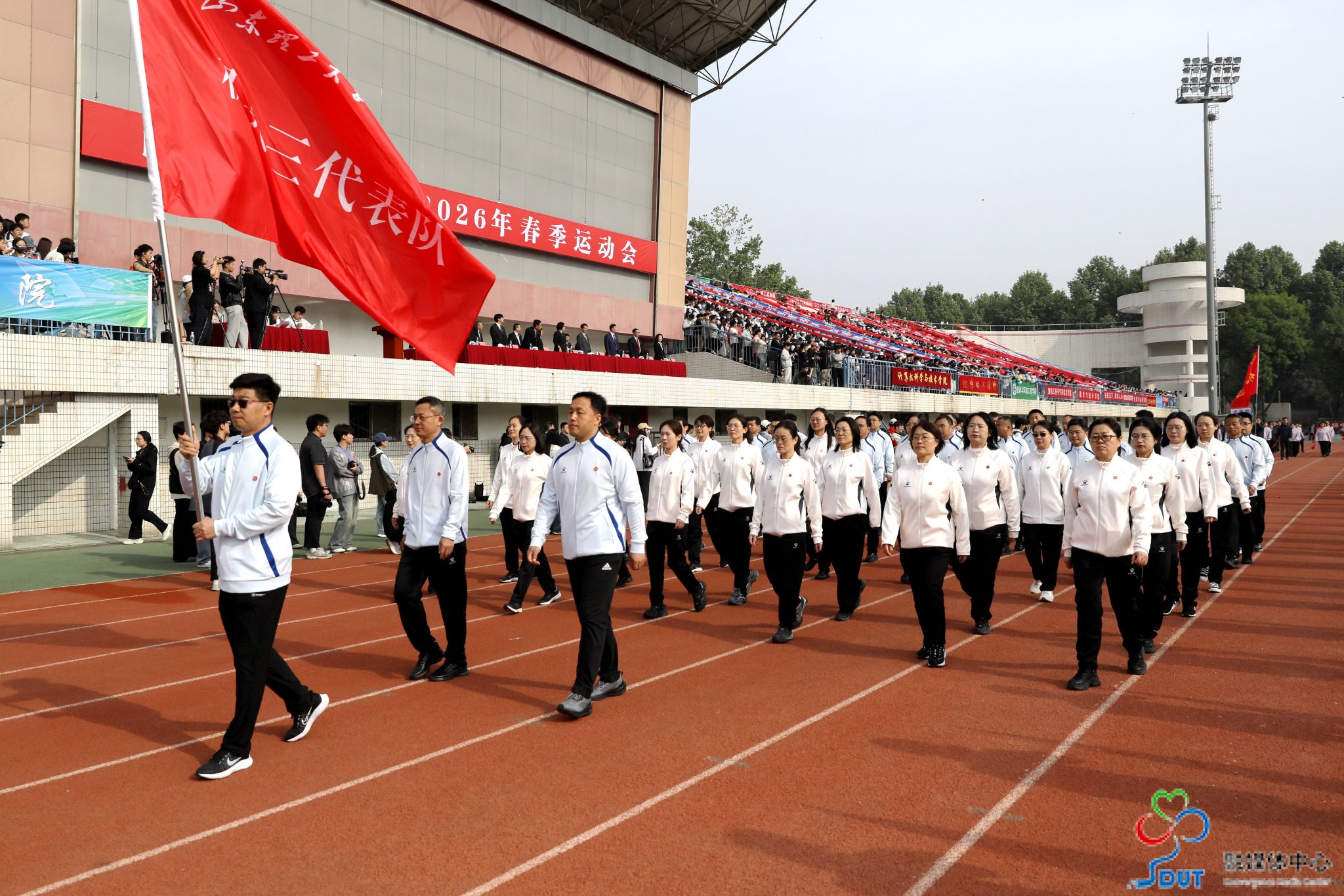 本网讯 草长莺飞,春和景明。4月23日上午,学校2026年春季运动会在西校区中心体育场隆重开幕,校领导李玉霞、苏守波、杜方岭、郭庆兵、陈盛伟、崔焕勇、陈靖、庞秋香及大会主席团成员出席开幕式并在主席台就座。开幕式由党委常委、副校长,学校体育运动委员会主任陈靖主持。