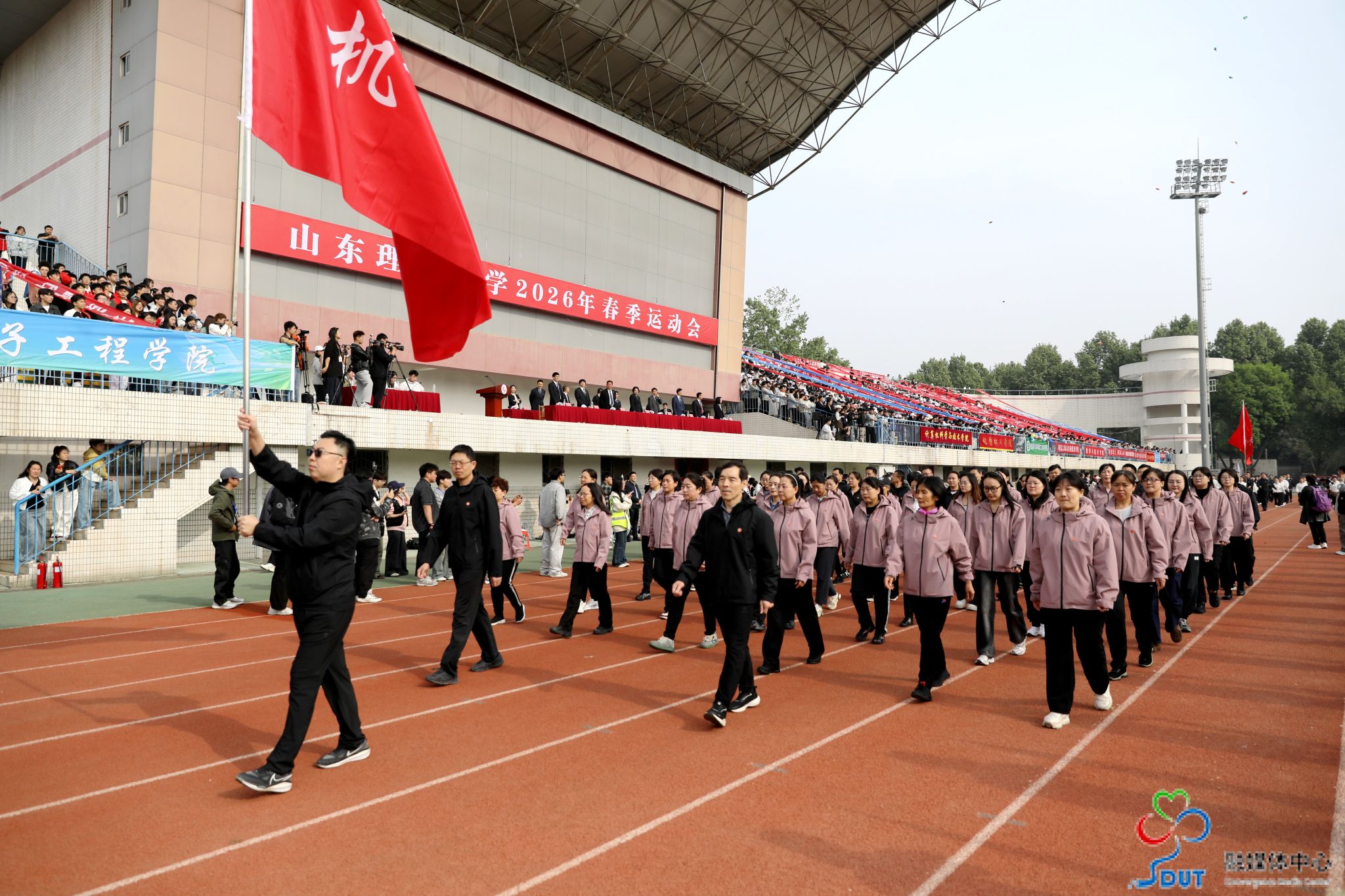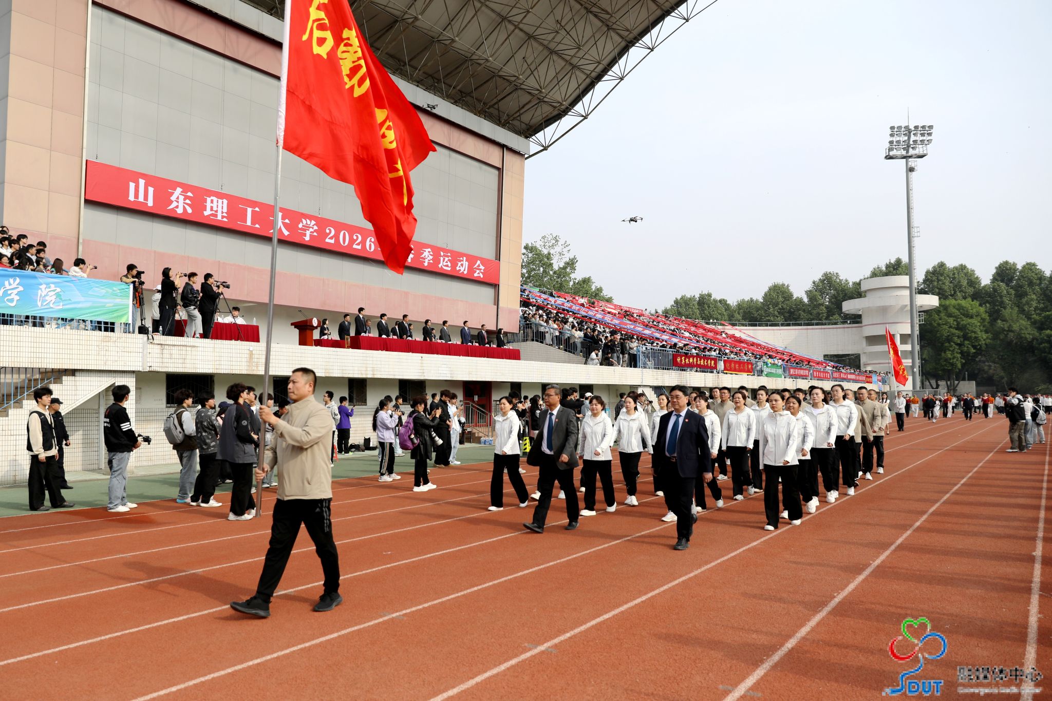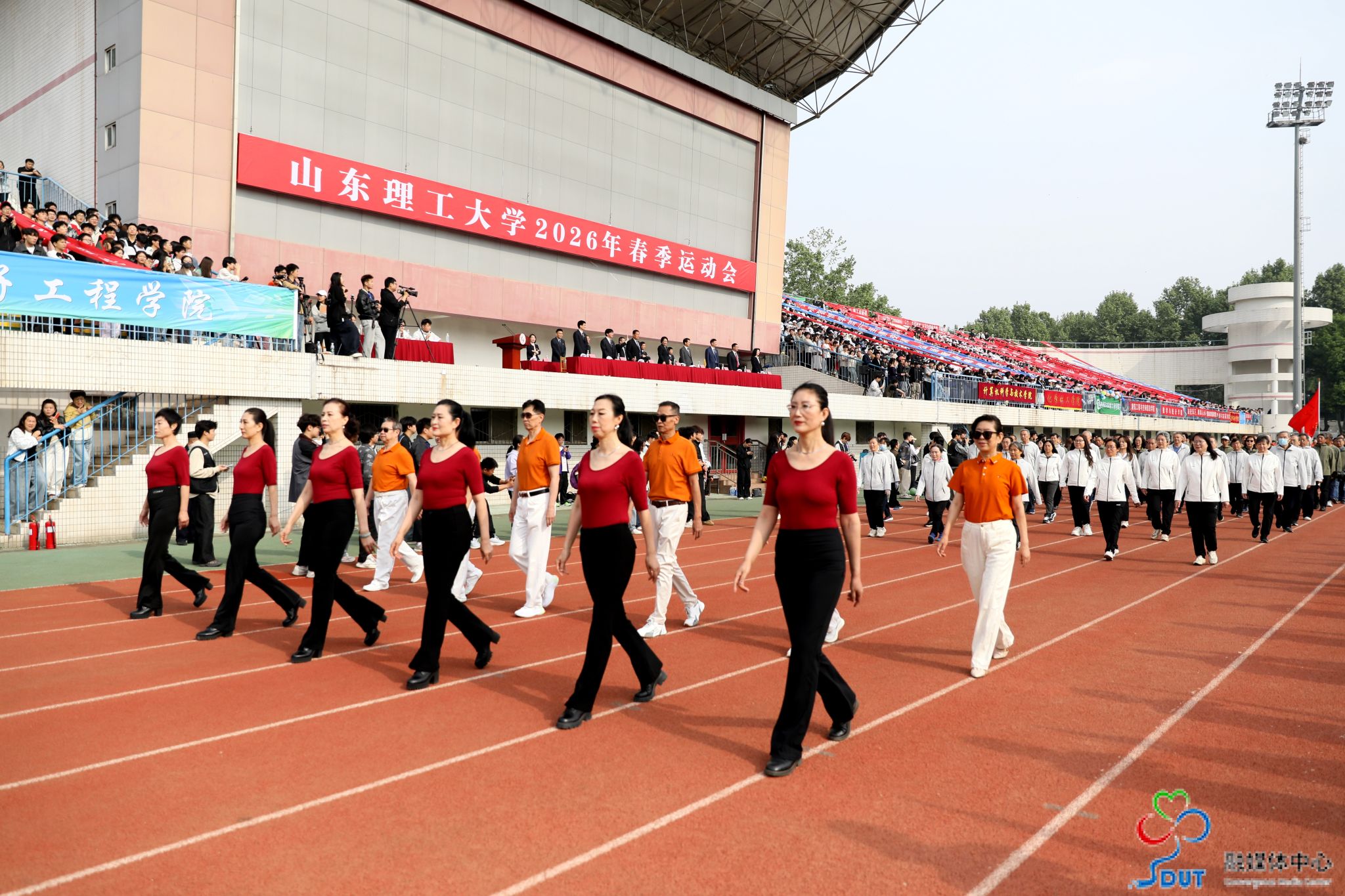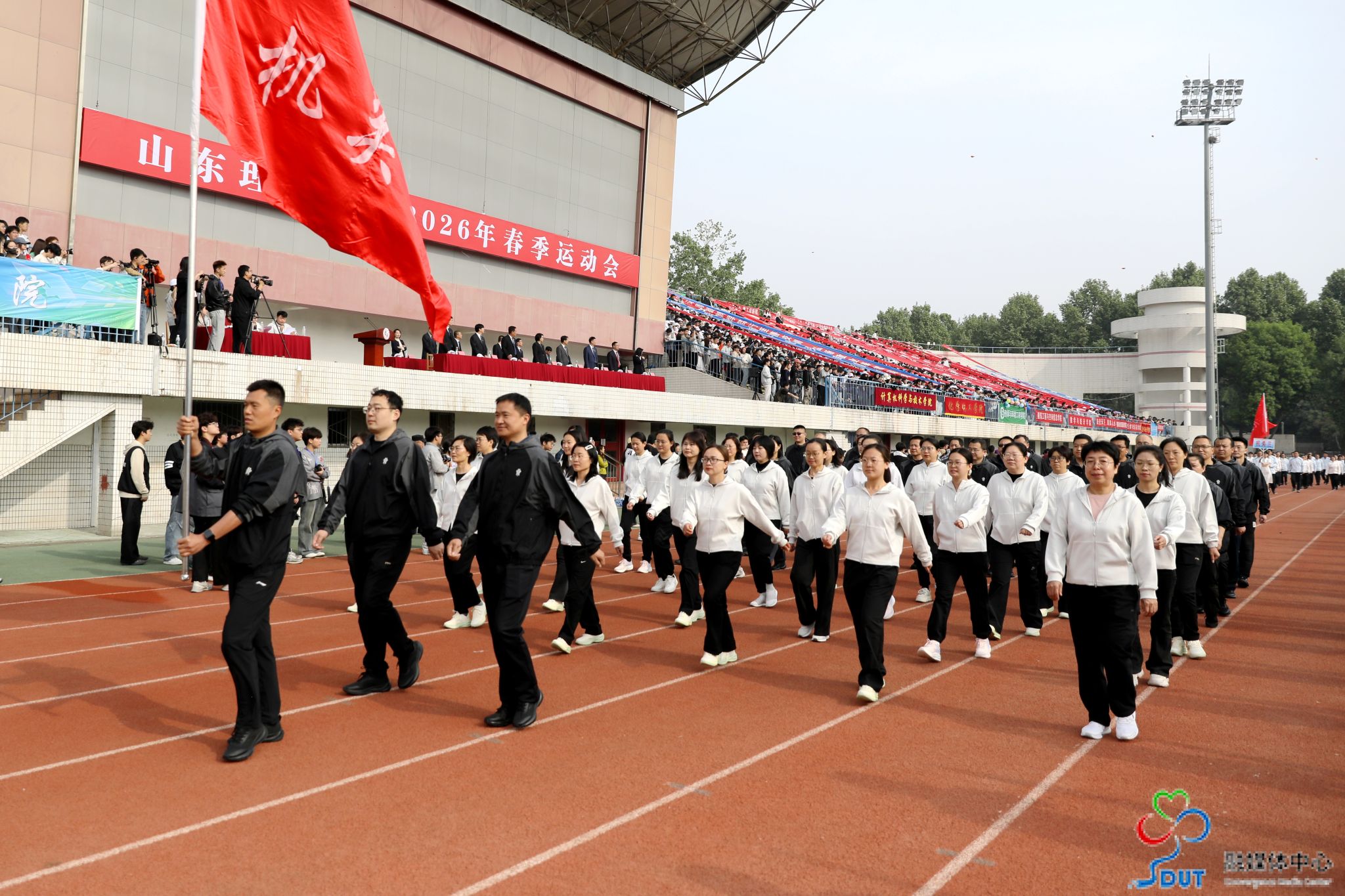 本网讯 草长莺飞,春和景明。4月23日上午,学校2026年春季运动会在西校区中心体育场隆重开幕,校领导李玉霞、苏守波、杜方岭、郭庆兵、陈盛伟、崔焕勇、陈靖、庞秋香及大会主席团成员出席开幕式并在主席台就座。开幕式由党委常委、副校长,学校体育运动委员会主任陈靖主持。