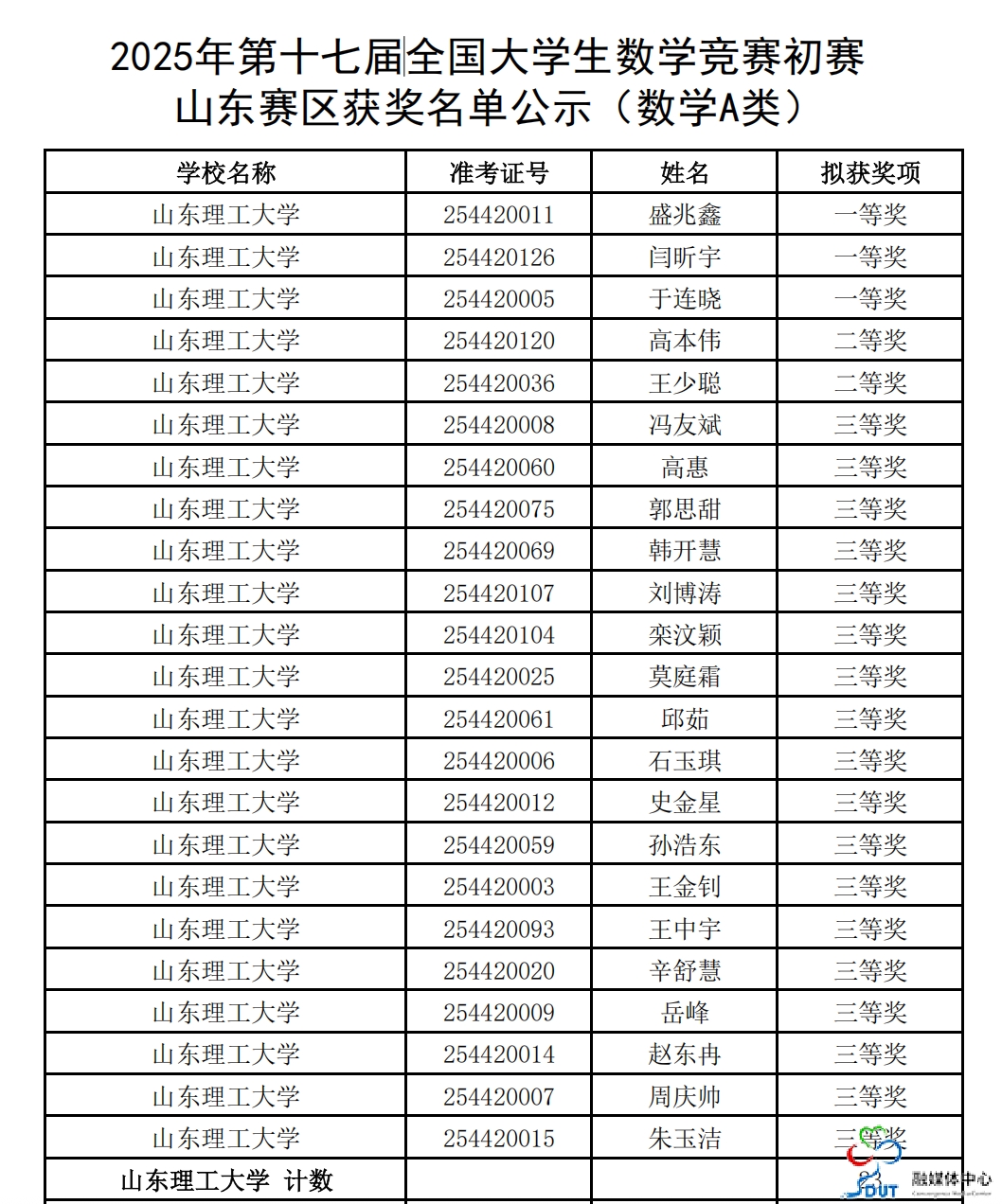 本网讯 在2025年11月8日举行的第十七届全国大学生数学竞赛初赛中,我校数学与统计学院有23名参赛学生在数学A类竞赛中荣获佳绩,取得一等奖3人、二等奖2人、三等奖18人的好成绩,其中2名学生取得全国决赛资格。